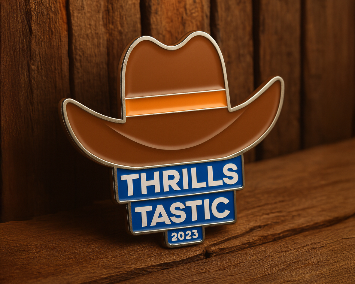 Breng het Wilde Westen tot leven met de ThrillsTastic Wilde Westen Pin! Deze opvallende verzamelpin, met cowboyhoed en frisse blauwe details, is perfect voor fans van pretparken. Een must-have voor elke pinverzamelaar en ThrillsTastic-fan!